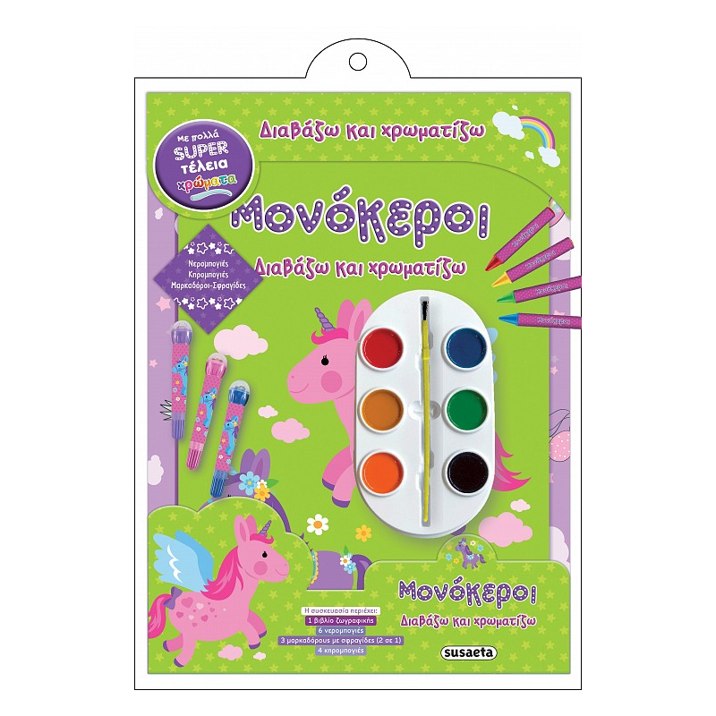 Μπες στον πολύχρωμο κόσμο των μονόκερων και χρωμάτισε τα σκηνικά με τις κηρομπογιές, τους μαρκαδόρους και τις νερομπογιές που συνοδεύουν το βιβλίο! Οι σφραγίδες με τα όμορφα σχέδια θα κάνουν τις χρωμοσελίδες σου αληθινά υπέροχες!