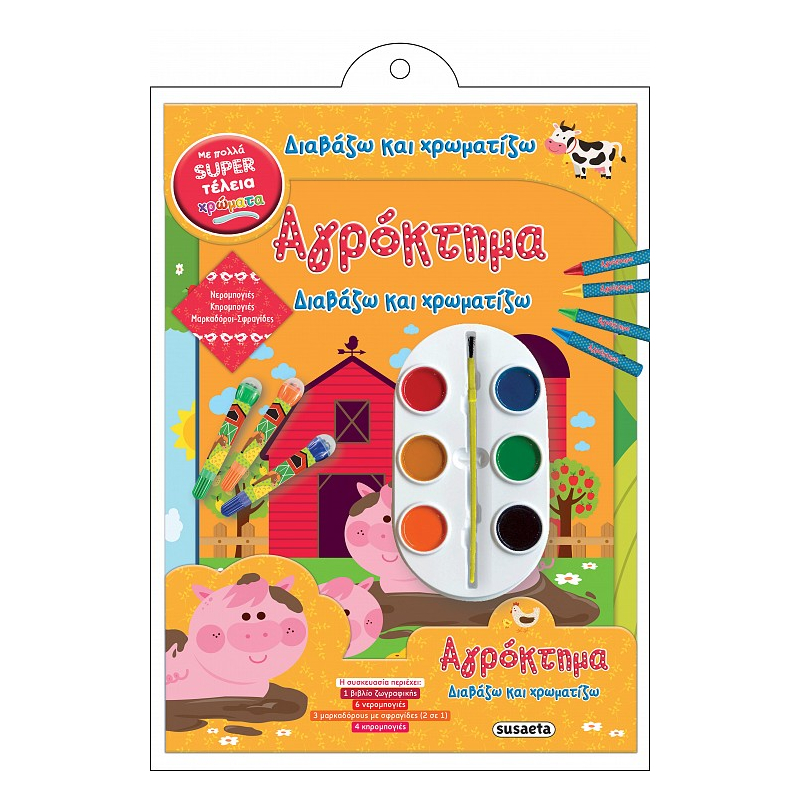 Μπες στον πολύβουο κόσμο του αγροκτήματος και χρωμάτισε τα σκηνικά με τις κηρομπογιές, τους μαρκαδόρους και τις νερομπογιές που συνοδεύουν το βιβλίο! Οι σφραγίδες με τα όμορφα σχέδια θα κάνουν τις χρωμοσελίδες σου αληθινά υπέροχες!