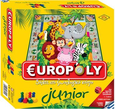 Επιτραπέζιο Junior Europoly (03-211).H €uropoly Junior είναι μια παιδική έκδοση του κλασικού επιτραπέζιου παιχνιδιού αγοραπωλησίας ακινήτων, για 2 έως 4 παίκτες, από 5 ετών. Κάνοντας βόλτα στον ζωολογικό κήπο, τα παιδιά προσπαθούν να τοποθετήσουν τα δικά τους σπιτάκια-ταμεία σε όσα περισσότερα σημεία μπορούν και να μαζέψουν χρήματα. Όποιο παιδί καταφέρει να συγκεντρώσει τα περισσότερα όταν τελειώσει το παιχνίδι, είναι ο νικητής. Ένα κεφάτο επιτραπέζιο παιχνίδι, για μικρές ηλικίες. Παράγεται στην Ελλάδα.