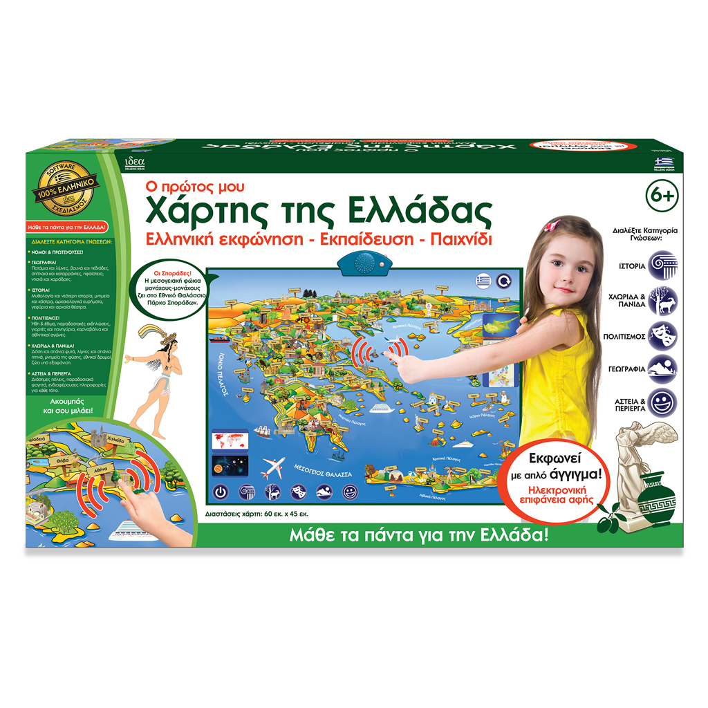 Είναι μια ηλεκτρονική επιφάνεια αφής, εύκολη στη χρήση της, που με ένα απλό άγγιγμα, σου δίνει πληροφορίες για όλη την Ελλάδα! Είναι εύκολο στη χρήση του, και απαραίτητο βοήθημα/αφίσα για κάθε παιδικό δωμάτιο. Πατήστε σε κάθε νομό/πόλη της Ελλάδας και ακούστε ενδιαφέρουσες πληροφορίες για την Ιστορία, τη Γεωγραφία, τον Πολιτισμό, την Χλωρίδα & Πανίδα κάθε περιοχής του τόπου μας! Διαλέξτε μια από τις παρακάτω κατηγορίες Γνώσεων: • Ιστορικά μνημεία, μυθολογία, νεότερη ιστορία • Χλωρίδα, Πανίδα • Ήθη και έθιμα του κάθε τόπου, γορτές και πανηγύρια • Γεωφυσικά χαρακτηριστικά, ποτάμια, βουνά και λίμνες • Αστεία – Περίεργα για κάθε τόπο. Ηλικίες: 6+ ετών. Περιεχομένα: Ηλεκτρονική επιφάνεια/αφίσα αφής, Οδηγίες Χρήσης. Μπαταρίες: 3 ΑΑ μπαταρίες (δεν περιλαμβάνονται).
