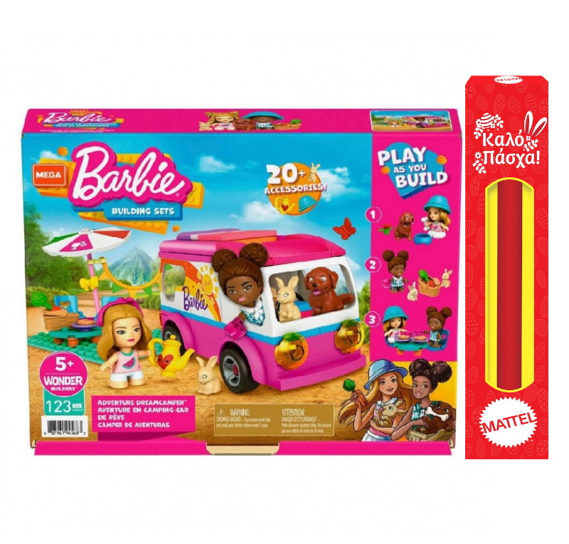 Ταξιδέψτε όπου θέλετε με τη φαντασία σας με το Τροχόσπιτο της Βarbie™! Κατασκευάστε το ροζ τροχόσπιτο, γεμίστε το με αξεσουάρ και ζήστε απίθανες ιστορίες στην ύπαιθρο. Εξερευνήστε τη φύση και βρείτε το τέλειο μέρος για να στήσετε ένα πικ νικ με αξεσουάρ, όπως ένα τραπέζι, καρέκλες, κρουασάν και άλλα. Όταν έρθει η ώρα για ύπνο, αφαιρέστε το πάνω μέρος του τροχόσπιτου, μετατρέποντάς το σε κάμπινγκ με 2 κρεβάτια όπου οι 2 μικρές κούκλες Barbie™ μπορούν να κοιμηθούν κάτω από τα αστέρια. Με αυτό το σετ, τα παιδιά μπορούν να κατασκευάσουν εύκολα και να φανταστούν πολλές ιστορίες σε κάθε βήμα κατασκευής. Ιδανικά για παιδιά 5 ετών και άνω