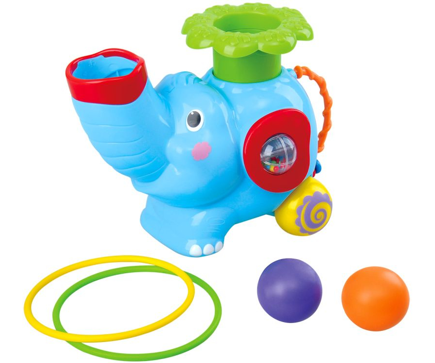 Playgo Παίξε με το Ελεφαντάκι (2993). Σπρώξτε την πλάτη του ελέφαντα προς τα κάτω και δείτε να εκτοξεύει μια μπάλα, πετάξτε ένα στεφάνι γύρω από την προβοσκίδα του ή παρακολουθήστε το να κυλα στα rollers του με μουσική.