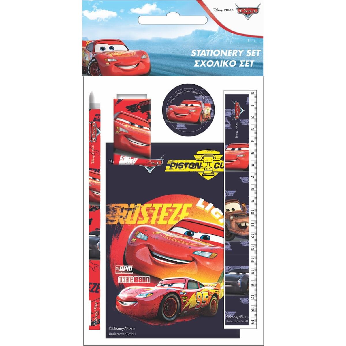 Gim Σετ Σχολικό και Μπλοκ Cars Σχολικό σετ που περιλαμβάνει μπλοκ σημειώσεων, μολύβι, χάρακα, ξύστρα και γόμα.