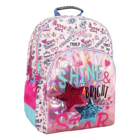 Ένα υπέροχο σχολικό σακίδιο πλάτης με ξεχωριστό σχέδιο από αστέρια, μικρά διαφορετικά σχεδιάκια, έντονα χρώματα, ιριδίζον ύφασμα και πούλιες που θα ενθουσιάσει κάθε μαθήτρια! Θα κάνει την διαφορά σε κάθε δραστηριότητα στο σχολείο, τη βόλτα και όχι μόνο!