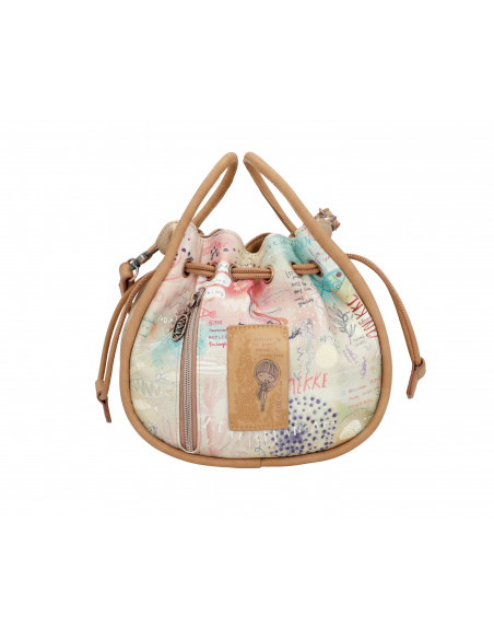 1 κεντρική θήκη με σούρωμα και μαγνητικό κούμπωμα. Εσωτερικά: 1 θήκη φερμουάρ και 2 θήκες κινητού. Εξωτερικά: 1 θήκη φερμουάρ πίσω και αποσπώμενος ιμάντας ώμου.