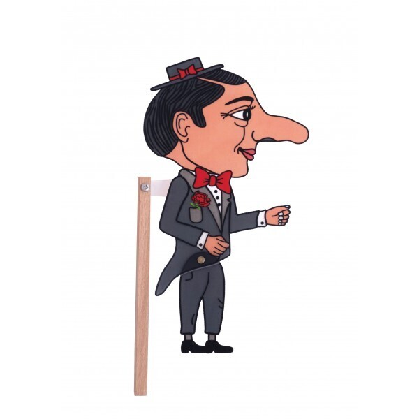 Πλαστική φιγούρα για θέατρο σκιών  με μεταλλικά κουμπώματα και ξύλινη χειρολαβή. Κατασκευάζεται  από μαλακό πλαστικό,  ελαφρύ και  φιλικό για τα παιδιά, βαμμένη  με οικολογικά χρώματα, έχει  μεταλλικά κουμπώματα ασφαλείας και ξύλινη χειρολαβή ύψους  20 εκ., που ανοιγοκλείνει  για εύκολη μεταφορά και αποθήκευση  και είναι προσαρμοσμένη πάνω στη φιγούρα με παξιμάδι ασφαλείας.
