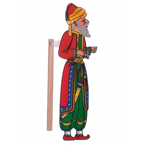 Πλαστική φιγούρα για θέατρο σκιών με μεταλλικά κουμπώματα και ξύλινη χειρολαβή. Κατασκευάζεται από μαλακό πλαστικό, ελαφρύ και φιλικό για τα παιδιά, βαμμένη με οικολογικά χρώματα, έχει μεταλλικά κουμπώματα ασφαλείας και ξύλινη χειρολαβή ύψους 20 εκ., που ανοιγοκλείνει για εύκολη μεταφορά και αποθήκευση και είναι προσαρμοσμένη πάνω στη φιγούρα με παξιμάδι ασφαλείας.
