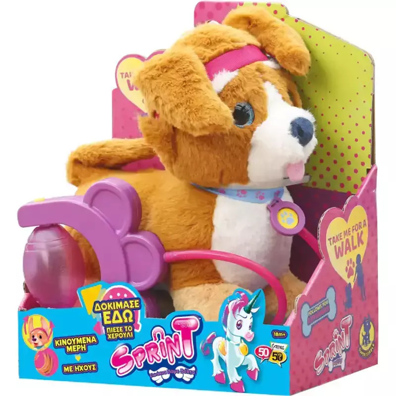Το πιο γρήγορο και χαριτωμένο κουτάβι που θα γίνει ο καλύτερός σου φίλος στις βόλτες. Είναι χνουδωτό και πολύ απαλό με καφετί και άσπρο χρώμα. Διαθέτει λουράκι σε ροζ χρώμα το οποίο πιέζοντάς το σηκώνει τα αυτιά και την ουρά του. Τα ειδικά ενσωματωμένα ροδάκια στις πατούσες του, του επιτρέπουν να κινείται σταθερά και γρήγορα. Παράγει ήχους αληθινού κουταβιού που γαβγίζει. Πάρε το κουτάβι σου και περπάτησε ή τρέξε μαζί του. Θα γίνει ο καλύτερος λούτρινος φίλος που είχες ποτέ στις βόλτες σου. Μέσω των παιχνιδιών της σειράς Sprint, καλλιεργείται το δημιουργικό παιχνίδι που ενεργοποιεί τη φαντασία του παιδιού και του δίνει τη δυνατότητα να εκφραστεί και να αναπτύξει τις δεξιότητές του, κινητικές, διαπροσωπικές, κοινωνικές, κ.α. Τα παιδιά χρειάζονται ενθάρρυνση για να παίξουν και να σκέφτονται δημιουργικά, έτσι παρέχοντάς τους τη δυνατότητα συμμετοχής σε δημιουργικά παιχνίδια, τα ωθούμε στο να παράγουν νέες ιδέες.