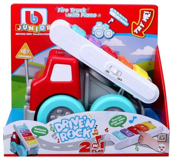 Διασκεδαστικό έγχρωμο πυροσβεστικό όχημα με κινητό πιάνο. Το πιάνο έχει πέντε πλήκτρα με διαφορετικούς προκαθορισμένους ήχους. Με αυτό το φορτηγό μπορείτε να μάθετε στα παιδιά σας όχι μόνο να αγαπούν τη μουσική, αλλά και να ενθαρρύνετε τον συντονισμό μεταξύ των ματιών και των χεριών τους.