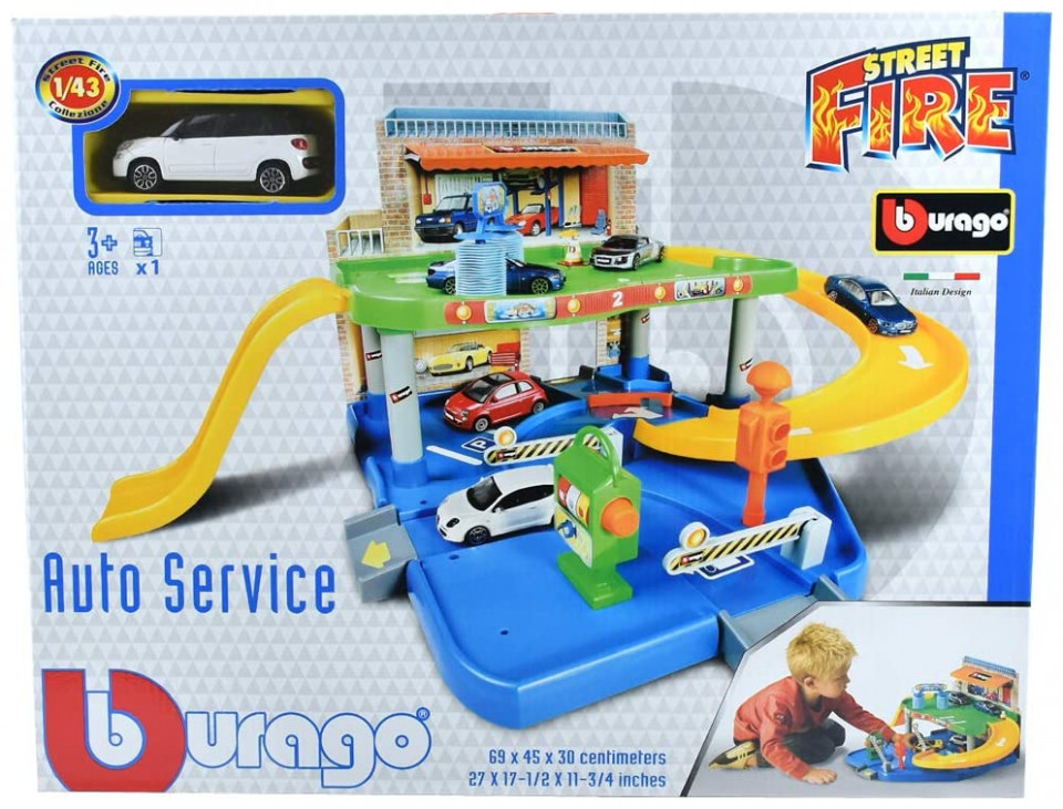 Αυτοκινητάκι με γκαράζ, από την Burago. Στο Γκαράζ αυτοκινήτων μπορείς να παρκάρεις το αυτοκίνητο σου, να το πας στο πλυντήριο και να βάλεις βενζίνη κατά την έξοδο σου από αυτό. Σετ παιχνιδιού Bburago.. Περιλαμβάνει 1 όχημα κλίμακας 1:43.