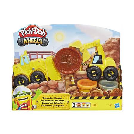 Περιλαμβάνονται εκσκαφέας, εμπρός φορτωτής, 1 βαζάκι πλαστοζυμαράκι Play-Doh Buildin’ και 2 βαζάκια πλαστοζυμαράκι Play-Doh Brand Modeling.