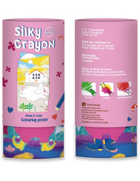 Μπορούν να χρησιμοποιηθούν με 3 διαφορετικούς τρόπους – ως κανονικά crayons, ως παστέλ ή ως νερομπογιές (χρησιμοποιώντας πινέλο και νερό). Διατίθεται σε 6 διαφορετικά χαρούμενα σχέδια μέσα σε κυλινδρική συσκευασία για αποθήκευση ενώ η συσκευασία περιέχει και ένα πόστερ 58x21cm διπλής όψεως.