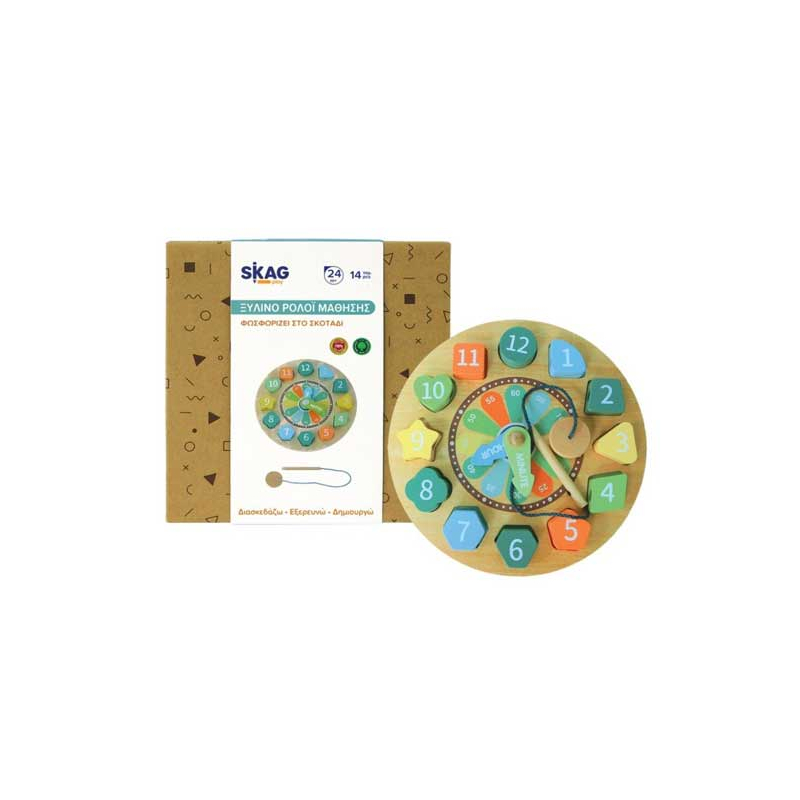 SKAG ξύλινο ρολόι μάθησης, ένα παιχνίδι που θα συναρπάσει το παιδί, καθώς θα μάθει να ταιριάζει τα διάφορα σχήματα με την αντίστοιχη θέση στο ρολόι. Το παιχνίδι αυτό είναι φωσφορίζον, οπότε μπορείς να παίξεις με το παιδί σου και στο σκοτάδι, δημιουργώντας μια μαγική ατμόσφαιρα. Βοηθάει το παιδί να αναπτύξει δεξιότητες όπως η ταξινόμηση, η συγκέντρωση, ο συντονισμός χεριού – ματιού, η αντίληψη και η συνειδητοποίηση του χώρου.
