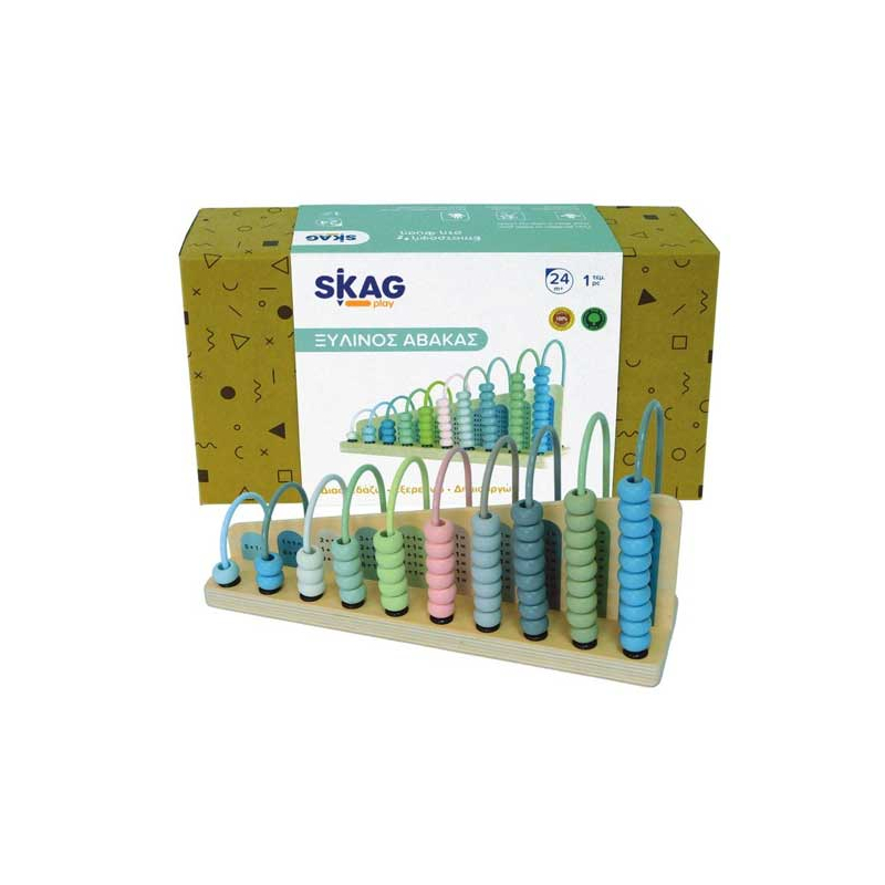 SKAG ξύλινος άβακας, ένα παιχνίδι που διδάσκει στο παιδί τους αριθμούς και το μέτρημα με έναν διασκεδαστικό και εκπαιδευτικό τρόπο, παίζοντας με τις χρωματιστές ροδέλες και αντιστοιχίζοντας το σωστό αριθμό ροδέλων στον κάθε στύλο. Βοηθάει το παιδί να αναπτύξει τις ικανότητές του με την αριθμητική, όπως επίσης και δεξιότητες όπως η λογική, η μνήμη, η προσοχή και η κινητικότητα.